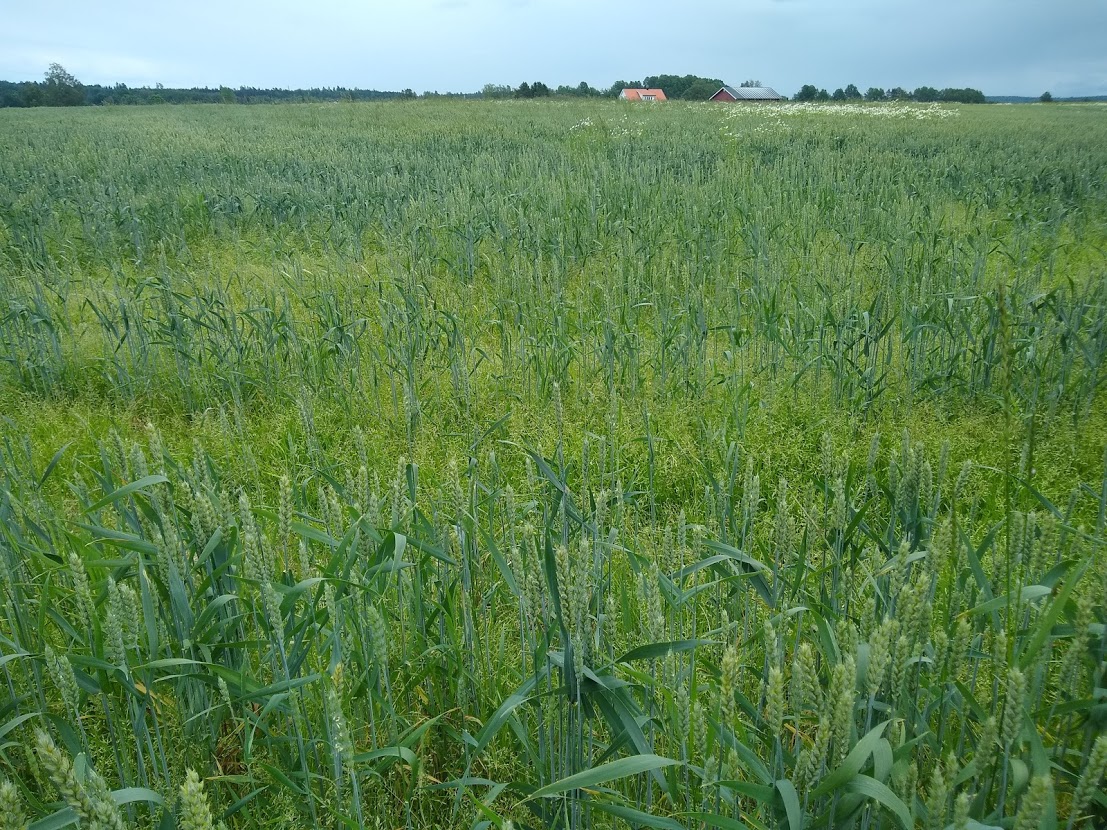 Det ser jevnt over bra ut, men det er hjørner av åkeren hvor jeg må konstatere at det blir mer tunrapp enn hvete. Et annet resultat av den strenge vinteren er flekkvise angrep av hvetestripesjuke/Chephalosporium. Mye oppfrost i vinter er antakelig årsaken til dette.