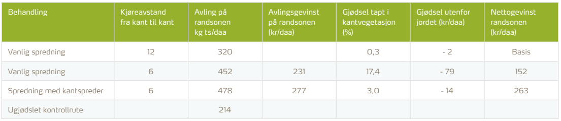 Riktig gjødsling i randsonen av jordet kan gi stor avlingsgevinst. En seks meter bred randsone på et 20 dekar stort skifte kan utgjøre hele 20 prosent av totalarealet på skiftet. Moderne kantsprederutstyr med hydraulisk skjerm koster ca. 8000 kroner, og optimaliserer enkelt og effektivt gjødselspredningen i randsonen. Sist sesong gjennomførte NLR Agder en kartlegging av effekten av kantsprederutstyr på to ulike lokaliteter. Resultatene viser at korrekt gjødsling i randsonen på jordet gir stor meravling og man unngår samtidig at gjødsel går tapt til omgivelsene. Presis gjødsling i randsonen av skiftet gir derfor en dobbel økonomisk gevinst, gjennom ekstra fôrmengde og spart gjødsel.