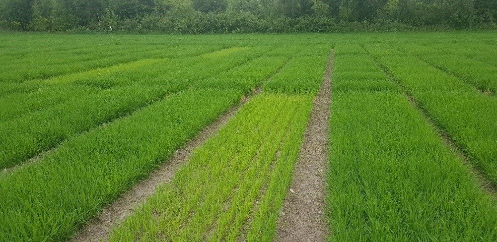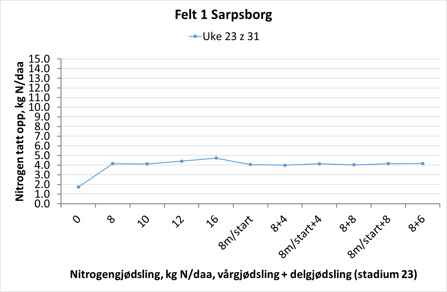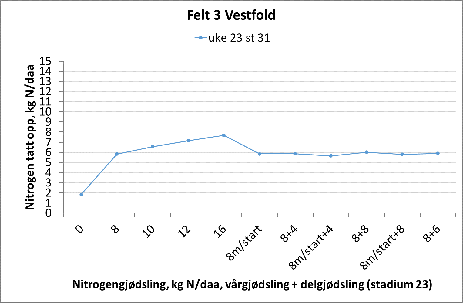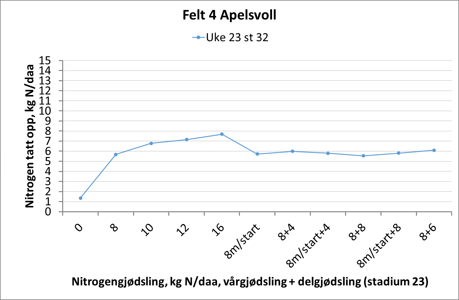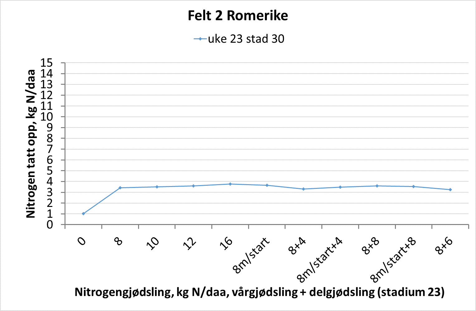 Felt 4. Østre Toten. Forsøksfeltet i Thermus på Apelsvoll ble anlagt 23. april og delgjødslet 31. mai når plantene var kommet til buskingsstadiet. N-sensormålingene ble gjennomført 9. juni. Da hadde plantene begynt strekkingsperioden, og hadde to leddknuter synlig (z 32). N-opptakskurven viser økt opptak med økende mengde N ved vårgjødslingen, men ingen effekt av delgjødslingen. Det kom ikke noe nedbør mellom delgjødsling og målinger, men i ettertid er feltet vannet med 30 mm vann. Ugjødsla ruter har tatt opp 1,3 kg N/daa i overjordisk biomasse. Foto: Annbjørg Øverli Kristoffersen