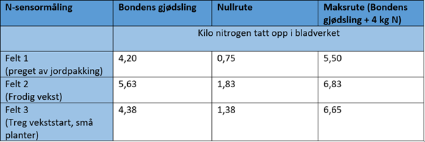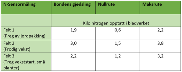 Estimert nitrogenopptak for de ulike feltene er presentert i tabellen under. Målingene ble utført 3. juni.