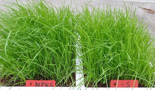 Symptomer på svovelmangel ligner på nitrogenmangel, men symptomene vises først på de yngste bladene.