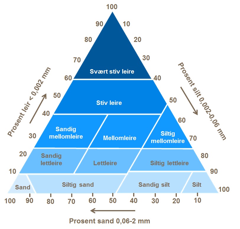 I et trekantet kornfordelingsdiagram over mineraljord finner vi tre ulike jordarter i hvert sitt hjørne, silt, sand og svært stiv leire. I intervallene mellom finner vi ulike varianter med større og mindre innblanding av sand, silt eller leire. Det er klassifisert 12 mineraljordarter i diagrammet. Kornfordelingen har effekt på jordas fysikalske egenskaper, vannkapasitet og egnethet for jordarbeiding, motstandsevne mot erosjon m.m. Selvfølgelig virker det også på jordas næringsstatus. I tillegg til de tolv mineraljordartene finnes organisk jord med ulik omdanningsgrad, og grovkornige mineraljordarter som ikke passer inn i trekanten.
