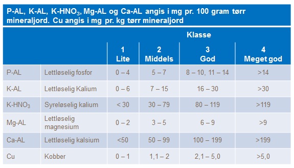 Jordprøvene analyseres vanligvis for surhet (pH), lettløselig fosfor (P-AL), kalium (K-AL), magnesium (Mg-AL) og kalsium (Ca-AL).