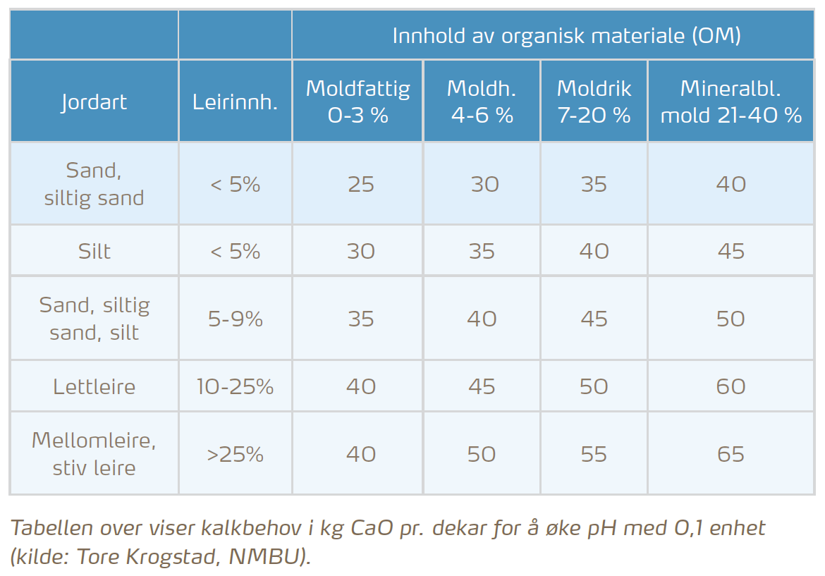 Den kalkmengden som skal til for å heve pH i jorda, er avhengig av