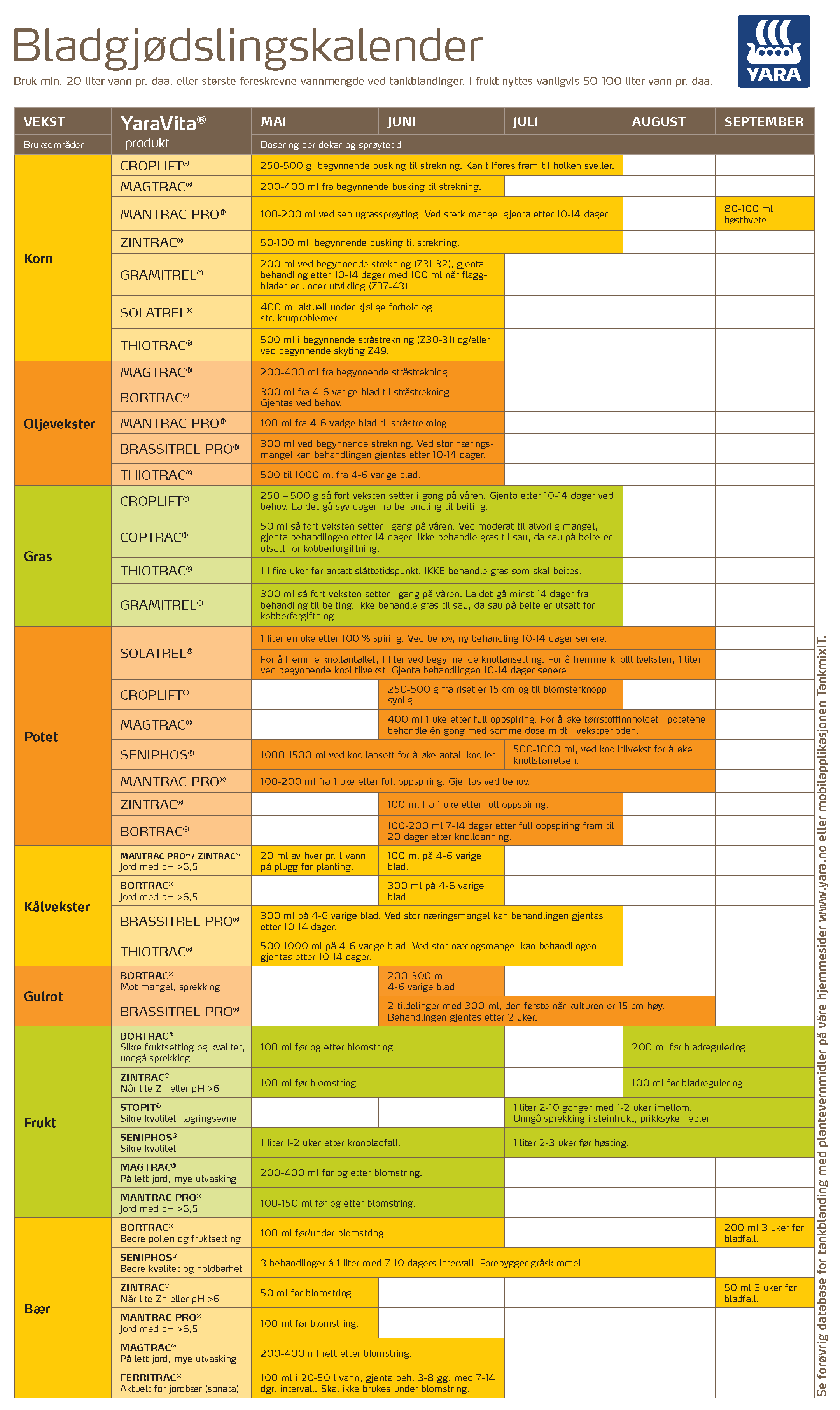 Riktig dosering og sprøytetid av YaraVita bladgjødsling er viktig et godt sluttresultat. Her får du YaraVita anbefalinger for ulike vekster.