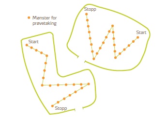 Enkeltprøver av plantemateriale må tas etter et nøye gjennomtenkt mønster over jordstykket. Et mønster som ser ut som en W kan tilpasses de fleste jordstykkers form og topografi (se tegning).