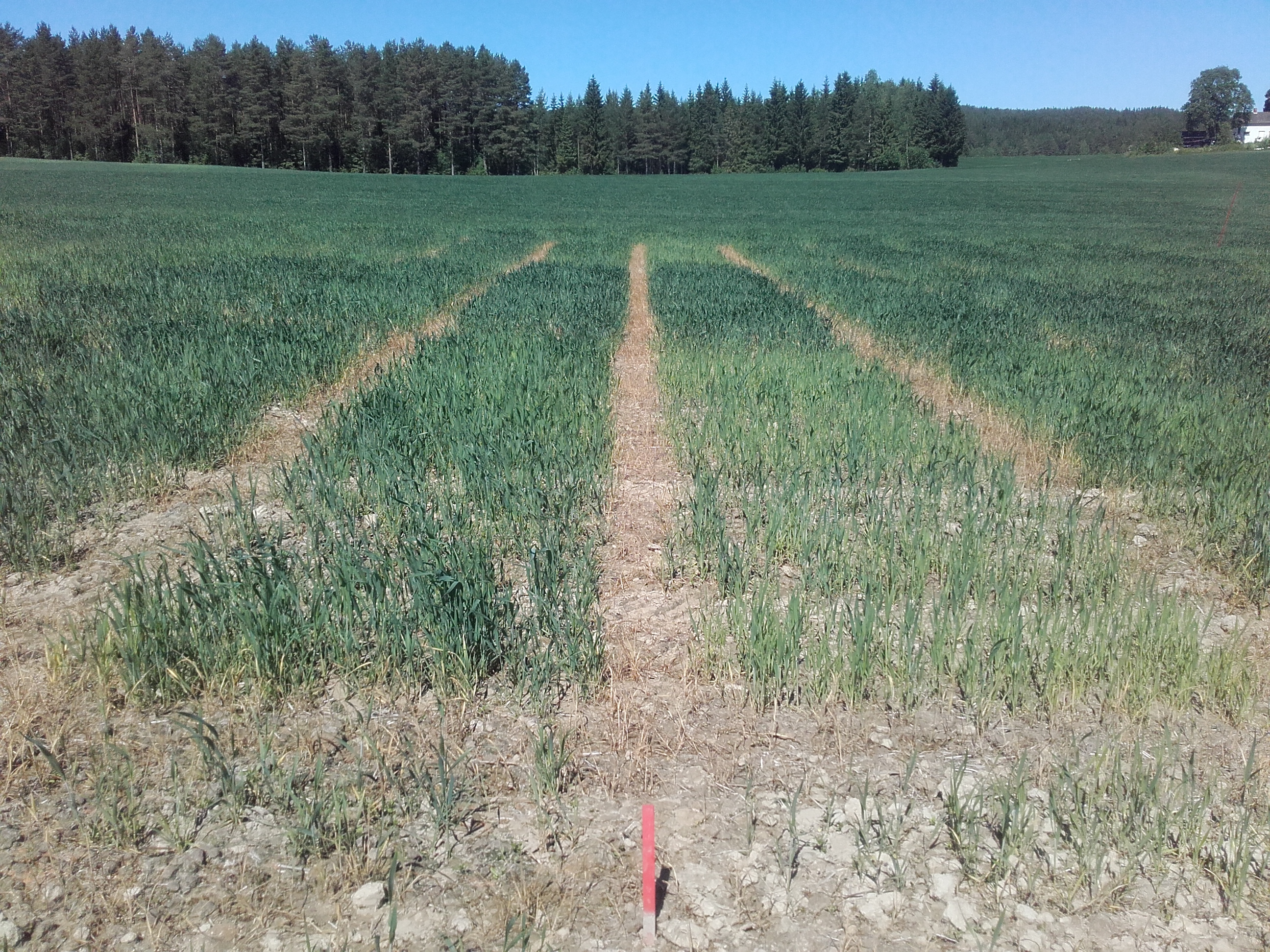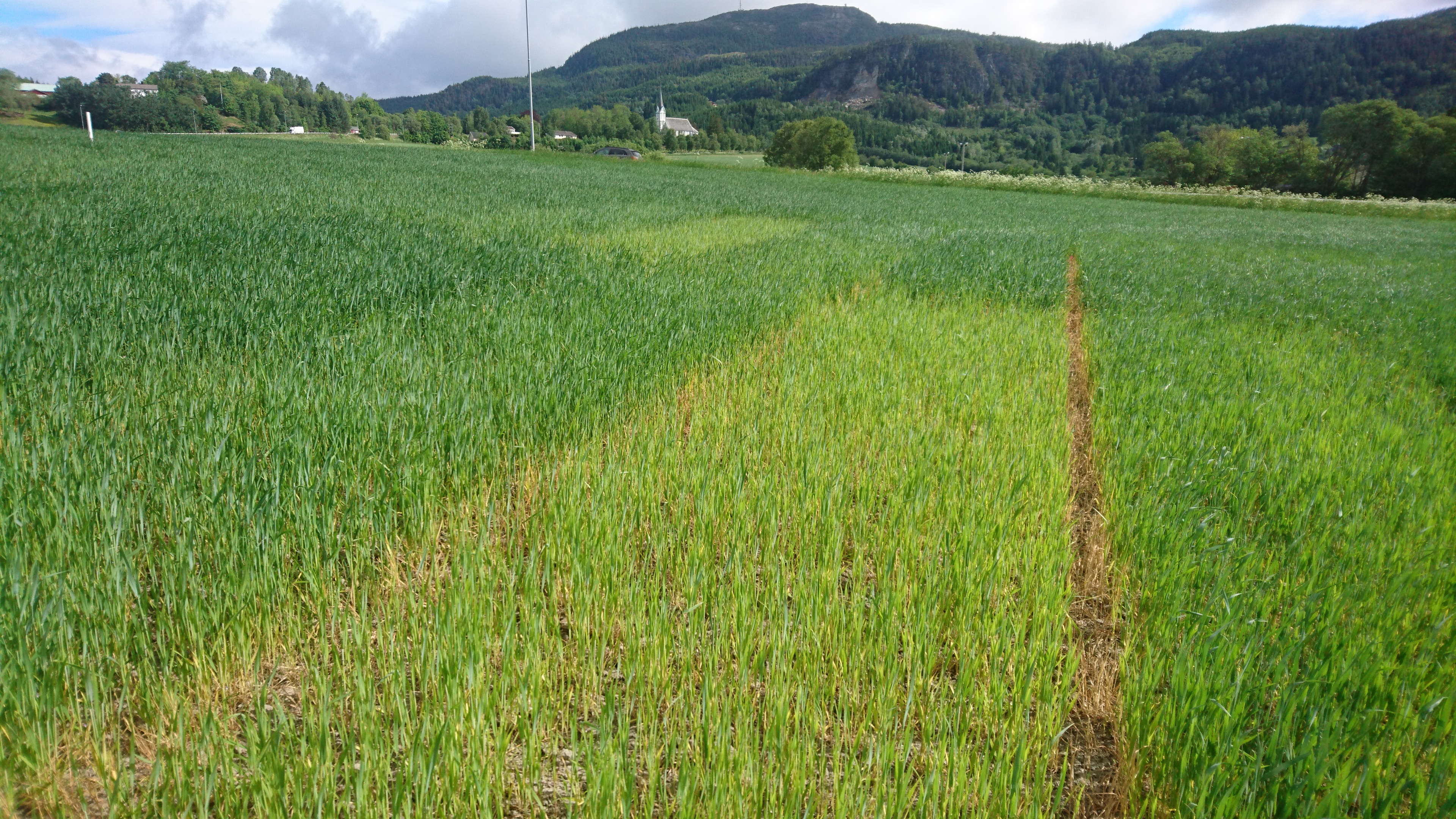 Det er gjort nye målinger med håndholdt N-sensor på feltene 4. og 5. juni. Det er stor spredning i utviklingstrinn og hvor mye kornet er preget av tørken og varmen. Feltene står best lengst sør. Her har kornet skutt, og målingene avsluttes for denne sesongen. Åkrene på Romerike har det tyngst. De er i avsluttende strekking og vil bli målt neste uke også. Feltet i Trøndelag står fint og vil bli målt en uke til. Opptaket av nitrogen siste uken varierer fra omtrent ikke noe og til ca. 2 kg N/daa.