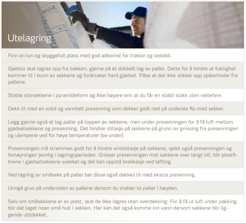 Før du mottar gjødsla bør du gjøre klar en godt egnet lagerplass, merke den og gi beskjed til transportør om hvor gjødsla skal plasseres. Det beste er å lagre gjødsla inne. Både ved inne- og utelagring må underlaget være godt drenert og fritt for skarpe steiner og gjenstander.