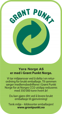 Grønt Punkt AS finansierer og drifter innsamling og gjenvinning av plastemballasje i Norge. Yara Norge er medlem i Grønt Punkt og innbetaler vederlag til returordningen slik at det er gratis for bonden å levere plasten til den kommunale innsamlingen.