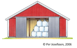 Storsekken må stå opp fra bakken, for eksempel på et underlag av paller. For å sikre stabil lagring med minimal veltefare, bør sekkene stables i pyramideform, to i høyden. Presenningen skal dekke mest mulig av stabelen og strammes godt slik at den ikke gnager mot sekkene ved vind og snø.