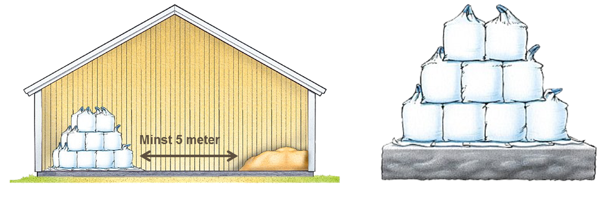 Ikke lag stablene med sekker for høye. Høye stabler kan bli ustabile og i verste fall kollapse. Begrens størrelsen på stablene til to, innendørs på flatt gulv kan tre storsekker i høyden være forsvarlig